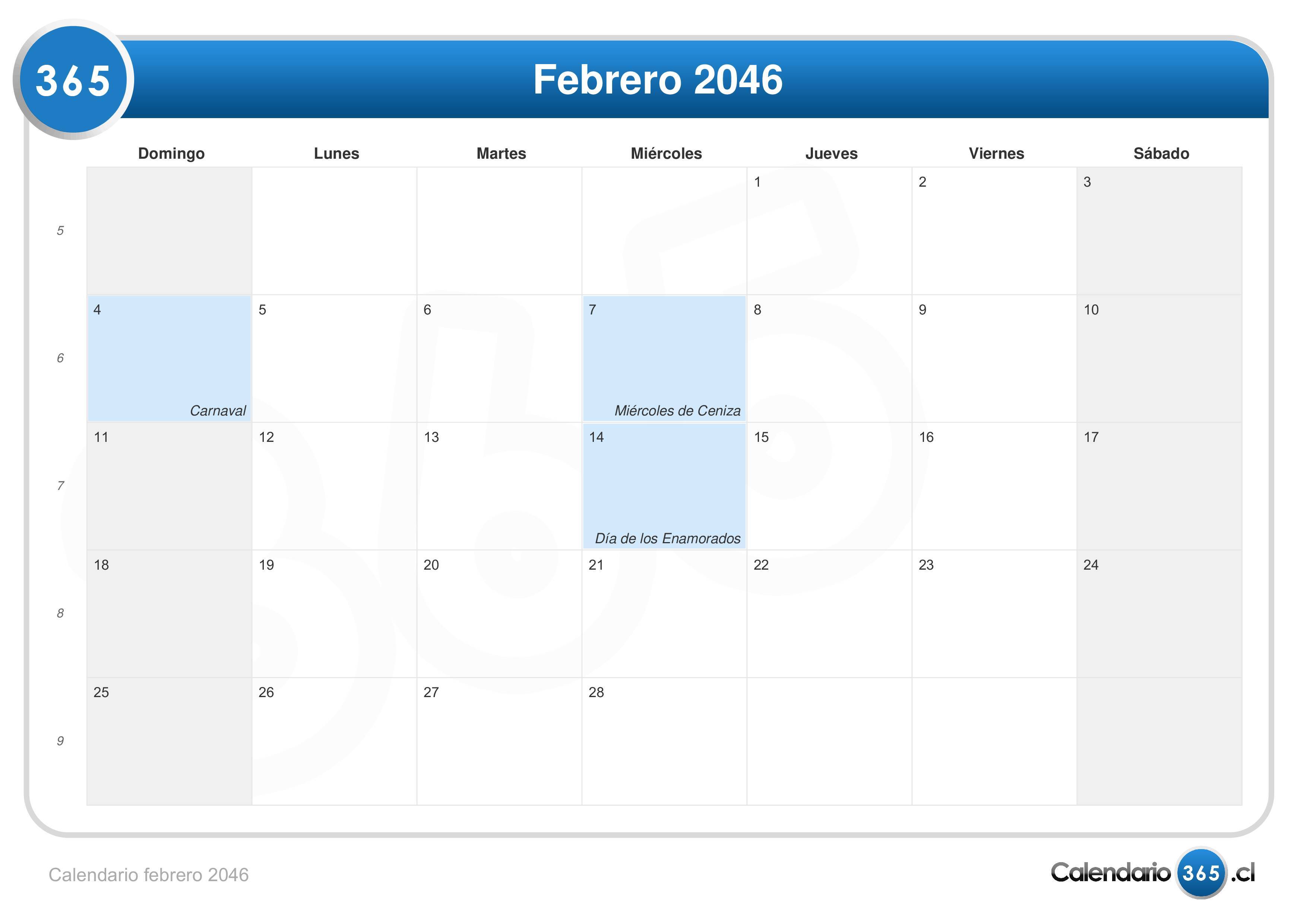 Consulta aquí el calendario mensual de febrero del 2046. Este incluye los números de las semanas.| 4 febrero | Carnaval |